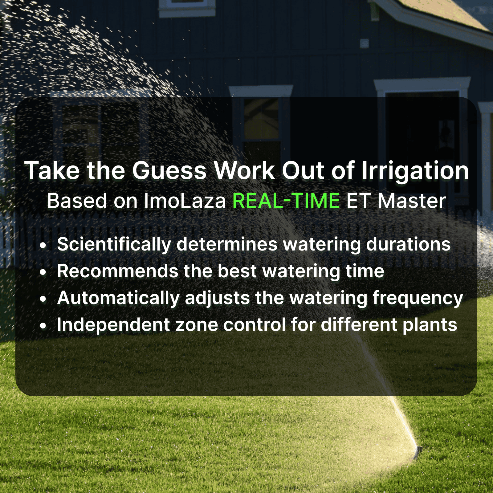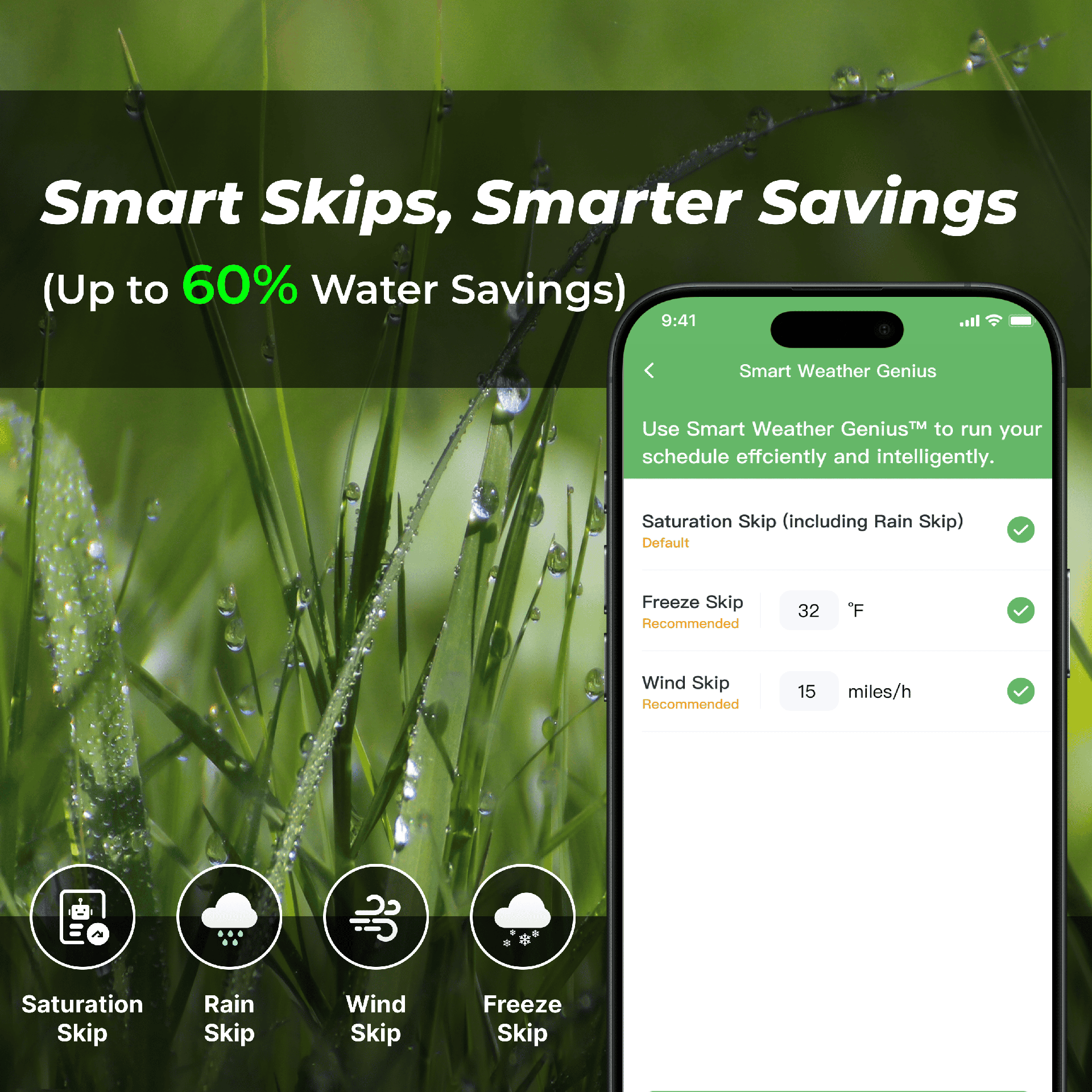 Rain Skip, Wind Skip, and Freeze Skip powered by ImoLaza Smart Weather Genius™. |