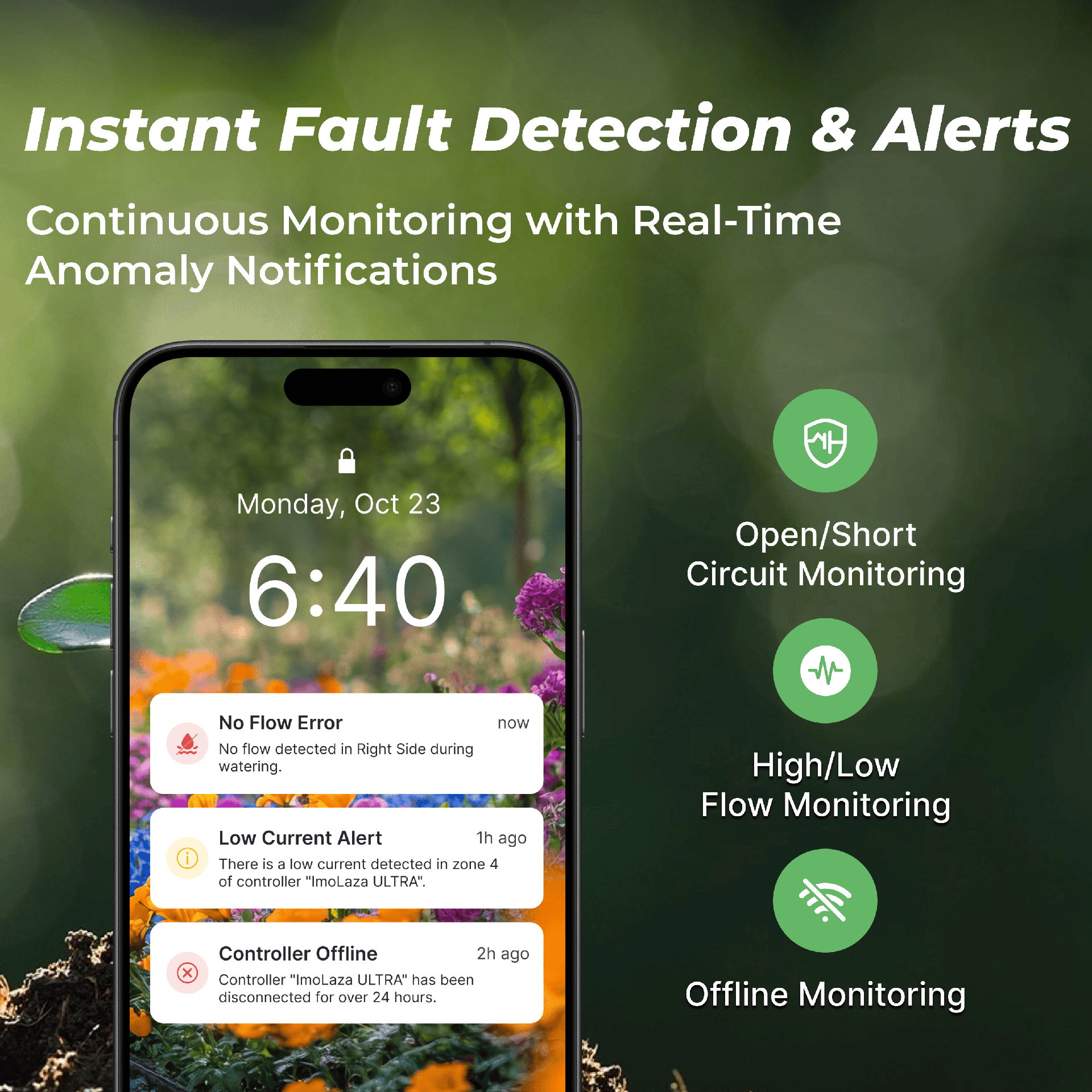 ImoLaza's Smart Fault Detection feature automatically detects issues in the irrigation system, such as controller offline, solenoid short circuits, or pipe leaks. It sends timely alerts via the app or email, helping you detect problems early, prevent equipment damage, and conserve water, ensuring the efficient operation of the irrigation system. |